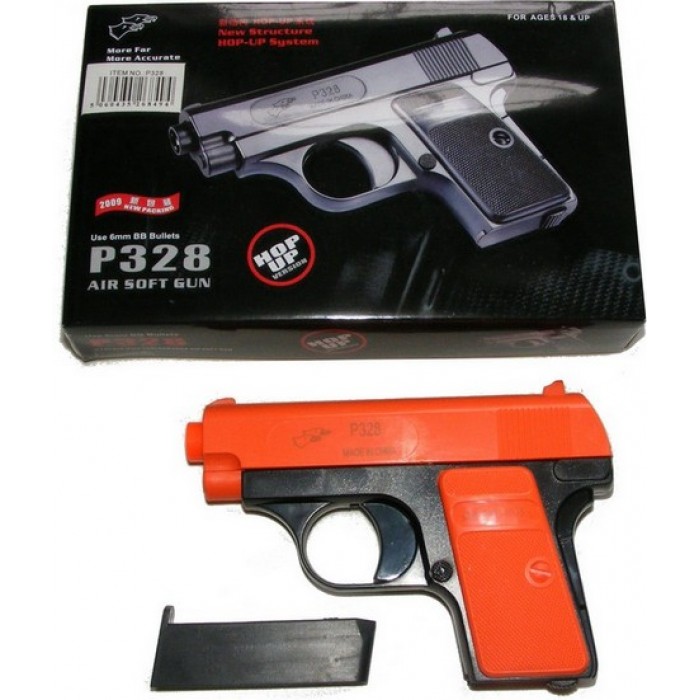 The Double Eagle P328 Spring Powered Plastic BB Gun Pistol is a plastic gun and it also has a plastic magazine that holds a maximum of 7 plastic BB pellets.    Velocity:  150 FPS.  Colour:  Orange and Black.  Dimensions:  14cm (L) x 10cm (H) x 2.9cm (W).  Weight:  130g.  A Small Packet of approximately 50 BB Pellets are included with this item.  All Spring Powered BB Gun needs to be cocked before each pellet can be fired.   Please be aware that this is a very powerful BB Gun, please be extra careful when using this item.  Eye Protection should be worn at all times.